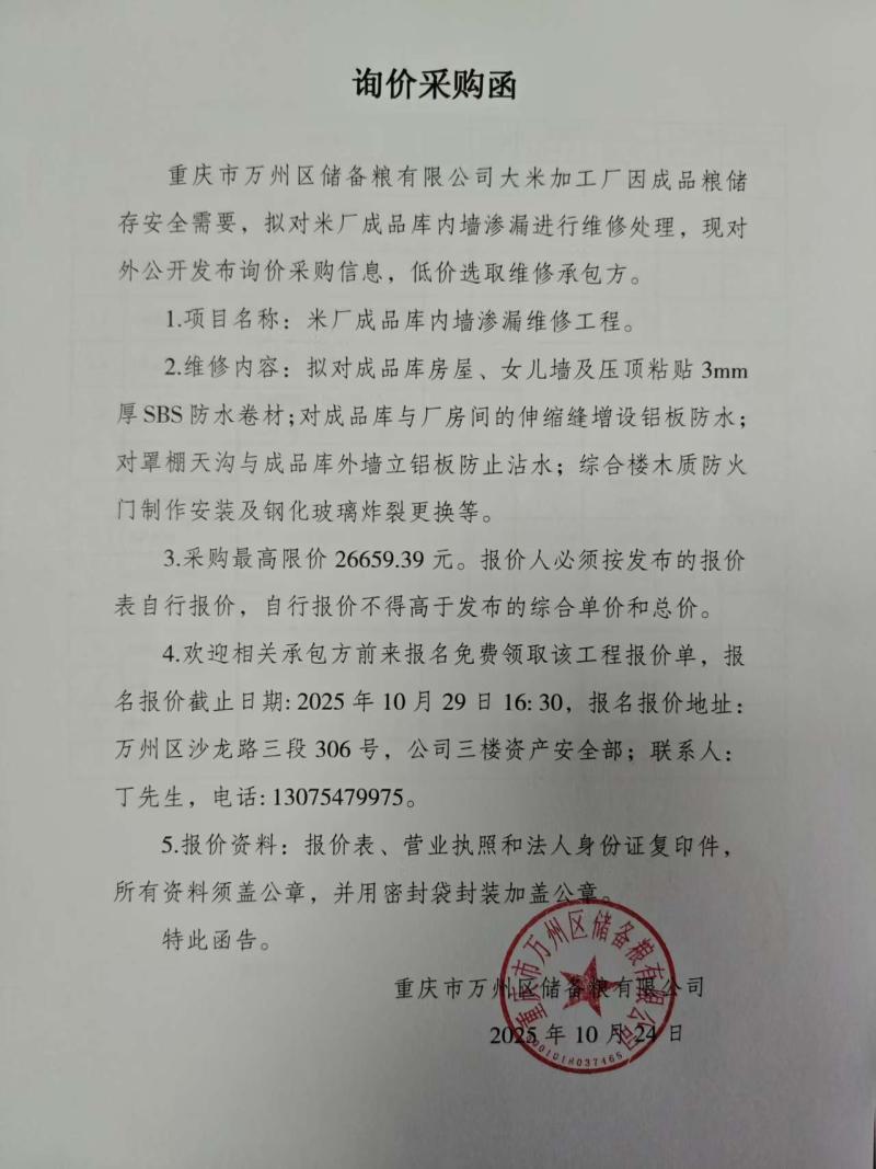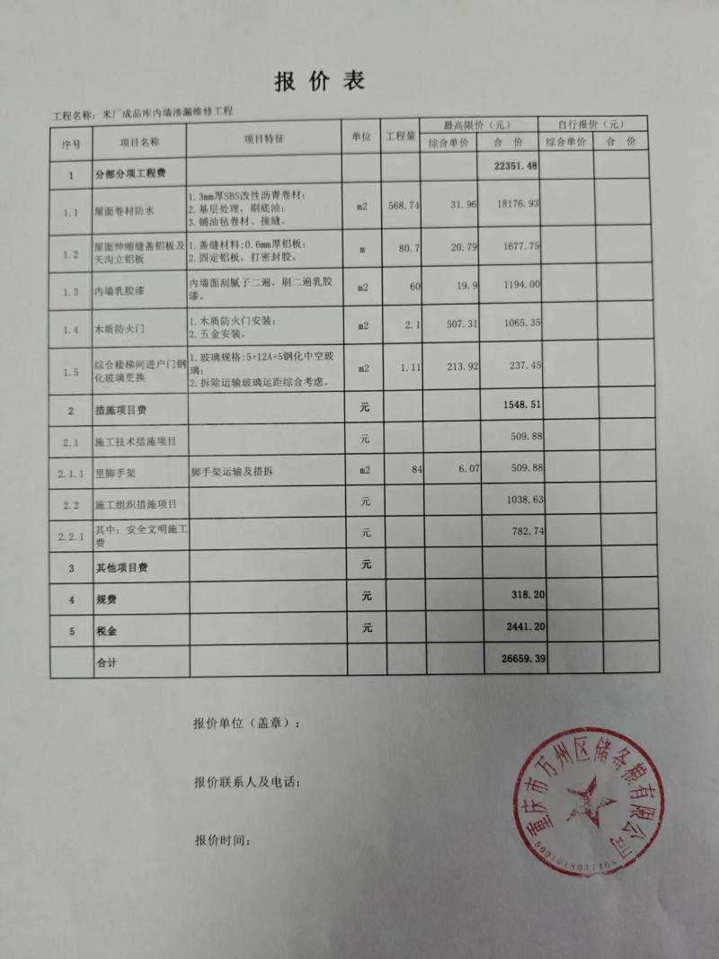 1.公司拟对米厂成品库内墙渗漏进行维修处理,维修内容详见报价表,现对外公开发布询价采购信息,低价选取维修承包方。